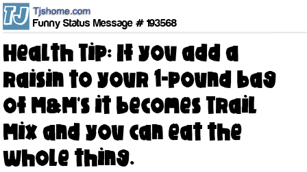 X says Health Tip: If you add a raisin to your 1-pound bag of M&M's it becomes Trail Mix and you can eat the whole thing.