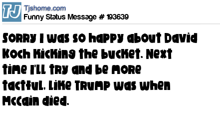 X is Sorry I was so happy about David Koch kicking the bucket. Next time I'll try and be more tactful, like Trump was when McCain died.