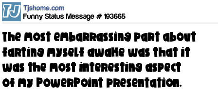 X says The most embarrassing part about farting myself awake was that it was the most interesting aspect of my PowerPoint presentation.