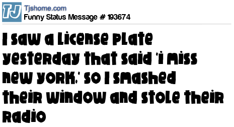 - # 57210 I saw a license plate yesterday that said "I miss New York", so I smashed their window and snatched their laptop...