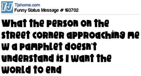 X says What the person on the street corner approaching me w a pamphlet doesn't understand is I want the world to end