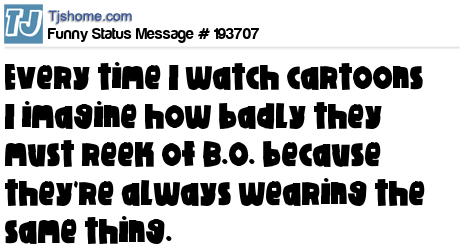 X says Every time I watch cartoons I imagine how badly they must reek of B.O. because they're always wearing the same thing.