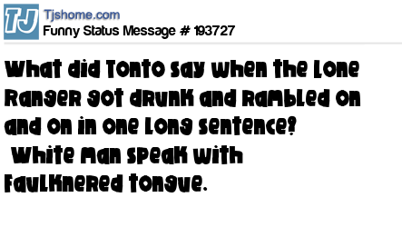 X says What did Tonto say when the Lone Ranger got drunk and rambled on and on in one long sentence? “White man speak with Faulknered tongue.”