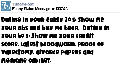 X says Dating in your early 20’s: Show me your abs and buy me beer. Dating in your 40’s: Show me your credit score, latest bloodwork, proof of vasectomy, divorce papers and medicine cabinet.