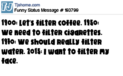 X says 1900: Let's filter coffee. 1950: We need to filter cigarettes. 1970: We should really filter water. 2015: I want to filter my face.