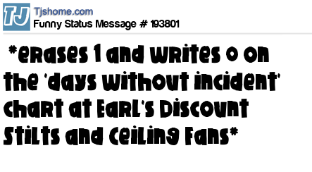 X says *erases 1 and writes 0 on the 'days without incident' chart at Earl's Discount Stilts and Ceiling Fans*