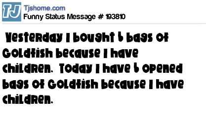 X says Yesterday I bought 6 bags of Goldfish because I have children. Today I have 6 opened bags of Goldfish because I have children.