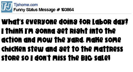 X says What's everyone doing for Labor day? I think I'm gonna get right into the action and mow the yard, make some chicken stew and get to the mattress store so I don't miss the BIG sale!