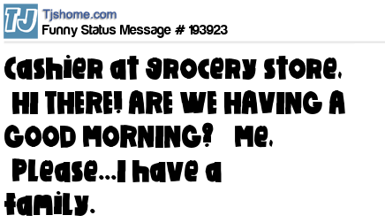 X says Cashier at grocery store, “HI THERE! ARE WE HAVING A GOOD MORNING?” Me, “Please...I have a family.”