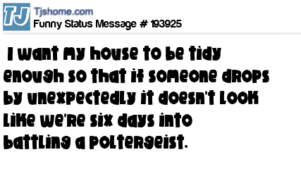 X says I want my house to be tidy enough so that if someone drops by unexpectedly it doesn't look like we're six days into battling a poltergeist.