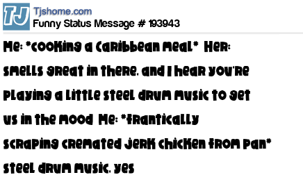 X says Me: *cooking a Caribbean meal* Her: smells great in there, and I hear you're playing a little steel drum music to get us in the mood Me: *frantically scraping cremated jerk chicken from pan* steel drum music, yes