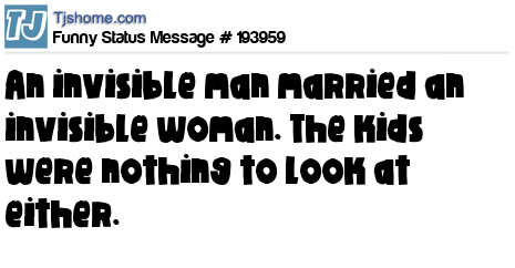 - # 193958 And the Terrible joke award goes to: An invisible man married an invisible woman. The kids were nothing to look at either.
