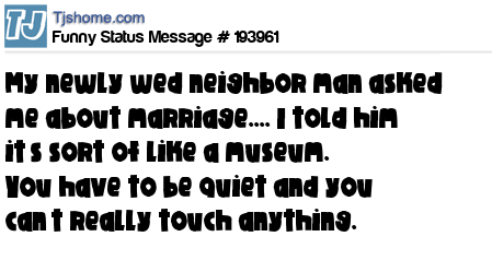 X says My newly wed neighbor man asked me about marriage.... I told him it’s sort of like a museum. You have to be quiet and you can’t really touch anything.