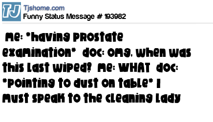 X says me: *having prostate examination* doc: omg, when was this last wiped? me: WHAT doc: *pointing to dust on table* I must speak to the cleaning lady