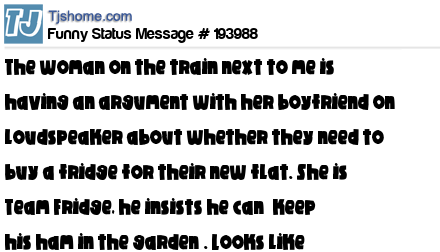 X says The woman on the train next to me is having an argument with her boyfriend on loudspeaker about whether they need to buy a fridge for their new flat. She is Team Fridge, he insists he can “keep his ham in the garden”. Looks like I’m missing my stop
