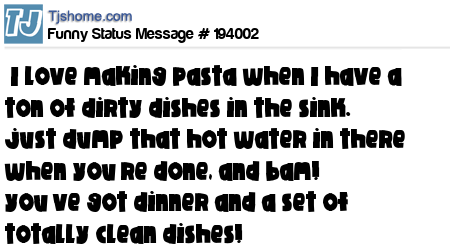 X says  I love making pasta when I have a ton of dirty dishes in the sink. just dump that hot water in there when you’re done, and bam! you’ve got dinner and a set of totally clean dishes!