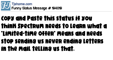 X is Copy and Paste this status if you think Spectrum needs to learn what a "Limited-time Offer" means and needs stop sending us never ending letters in the mail telling us that.