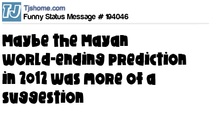 - # 40013 hosting a Mayan calendar party on Dec 22, 2012. Disregard this announcement if the world ends on Dec 21, 2012. Also, if the earth's magnetic field does not reverse by then, I'm planning to sponsor a pole flipping contest.
