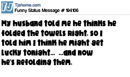 X says My husband told me he thinks he folded the towels right, so I told him I think he might get lucky tonight... ...and now he's refolding them.