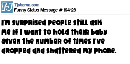 - # 96442 I'm surprised people still ask me if I want to hold their baby given the number of times I've dropped my phone.