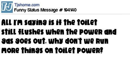 X says All I'm saying is if the toilet still flushes when the power and gas goes out, why don't we run more things on toilet power?