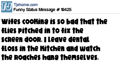 X wifes cooking is so bad that the flies pitched in to fix the screen door. I leave dental floss in the kitchen and watch the roaches hang themselves.