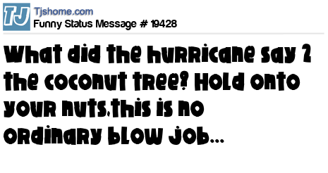 X says What did the hurricane say 2 the coconut tree? Hold onto your nuts,this is no ordinary blow job...