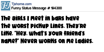 X says The girls I meet in bars have the worst pickup lines. They're like, "Hey, what's your friend's name?" Never works on me ladies.