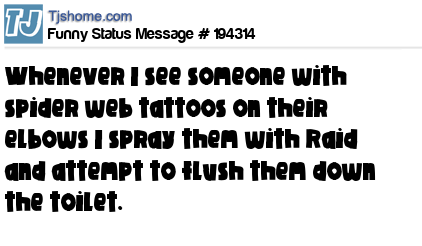 X says Whenever I see someone with spider web tattoos on their elbows I spray them with Raid and attempt to flush them down the toilet.