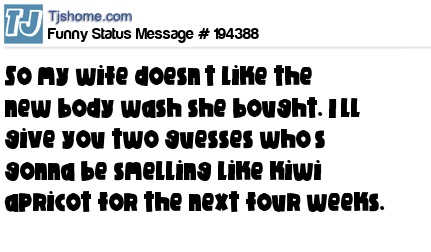 X says So my wife doesn’t like the new body wash she bought. I’ll give you two guesses who’s gonna be smelling like kiwi apricot for the next four weeks.
