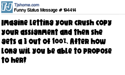 X says Imagine letting your crush copy your assignment and then she gets a 3 out of 100%. After how long wil you be able to propose to her?