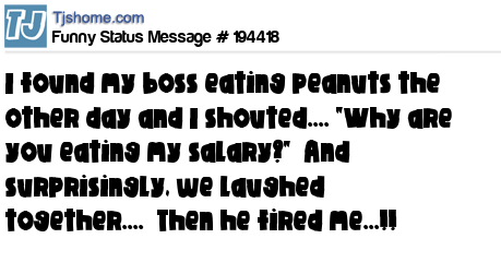 X says I found my boss eating peanuts the other day and I shouted.... "Why are you eating my salary?" And surprisingly, we laughed together.... Then he fired me...!!