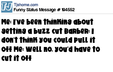 X says Me: I've been thinking about getting a buzz cut Barber: I don't think you could pull it off Me: Well no, you'd have to cut it off