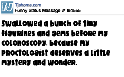 X says Swallowed a bunch of tiny figurines and gems before my colonoscopy, because my proctologist deserves a little mystery and wonder.