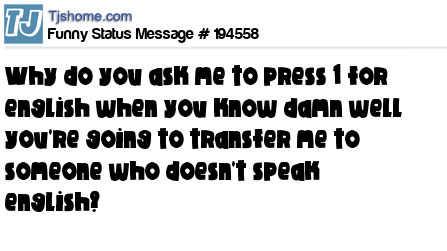 - # 164804 Why do I have to press "ONE" for English, when they just going to transfer me to someone I can't understand anyway?!?!