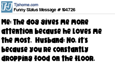 X says Me: The dog gives me more attention because he loves me the most. Husband: No, it's because you’re constantly dropping food on the floor.