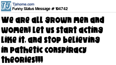 X is We are all grown men and women! Let us start acting like it, and stop believing in pathetic conspiracy theories!!!