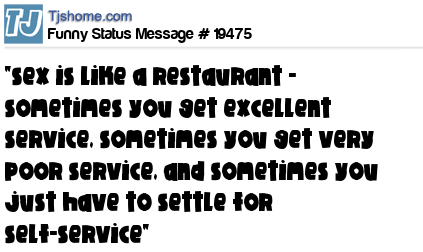 - # 79550 Sex is like a restaurent: Sometimes you get great service, Sometimes you get poor service, and sometimes you get self service.