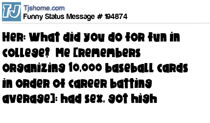 X says Her: What did you do for fun in college? Me [remembers organizing 10,000 baseball cards in order of career batting average]: had sex, got high