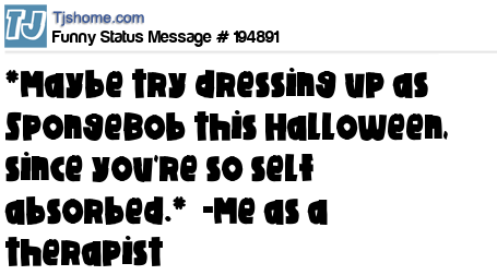 X says *Maybe try dressing up as SpongeBob this Halloween, since you're so self absorbed.*  -Me as a therapist