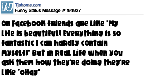 X is On Facebook friends are like "My life is beautiful! Everything is so fantastic I can hardly contain myself!" But in real life when you ask them how they're doing they're like "okay"