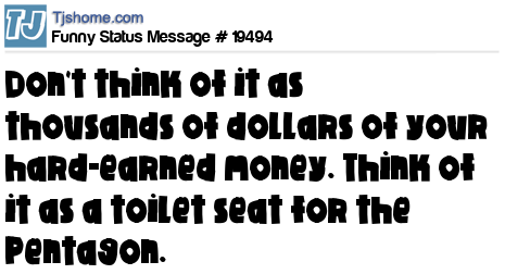 X Don't think of it as thousands of dollars of your hard-earned money. Think of it as a toilet seat for the Pentagon.