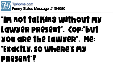 X says "Im not talking without my lawyer present".  Cop:"but you are the lawyer".  Me:  "Exactly, so where's my present"?