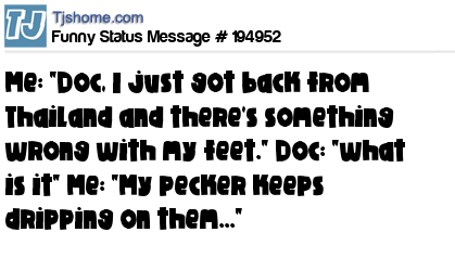X Me: "Doc, I just got back from Thailand and there's something wrong with my feet." Doc: "what is it" Me: "My pecker keeps dripping on them..."