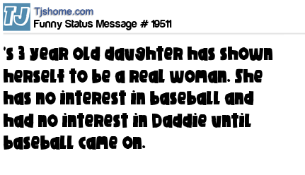 X 's 3 year old daughter has shown herself to be a real woman. She has no interest in baseball and had no interest in Daddie until baseball came on.
