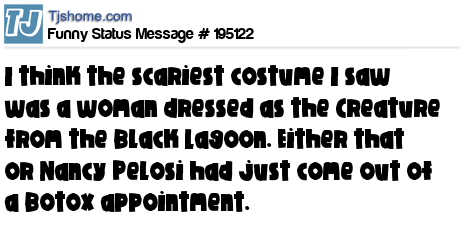 X says I think the scariest costume I saw was a woman dressed as the Creature from the Black Lagoon. Either that or Nancy Pelosi had just come out of a Botox appointment.