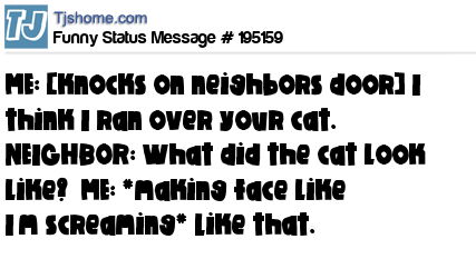 X says ME: [knocks on neighbors door] I think I ran over your cat. NEIGHBOR: What did the cat look like? ME: *making face like I’m screaming* Like that.