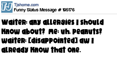 X says waiter: any allergies I should know about? me: uh, peanuts? waiter: [disappointed] aw I already know that one.