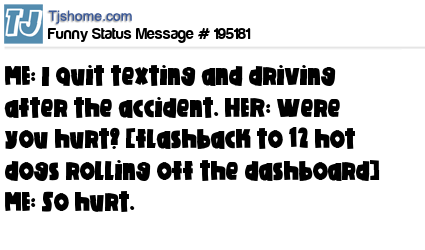 X says ME: I quit texting and driving after the accident. HER: Were you hurt? [flashback to 12 hot dogs rolling off the dashboard] ME: So hurt.