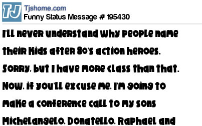 X says I'll never understand why people name their kids after 80's action heroes. Sorry, but I have more class than that. Now, if you'll excuse me, I'm going to make a conference call to my sons Michelangelo, Donatello, Raphael and Leonardo.